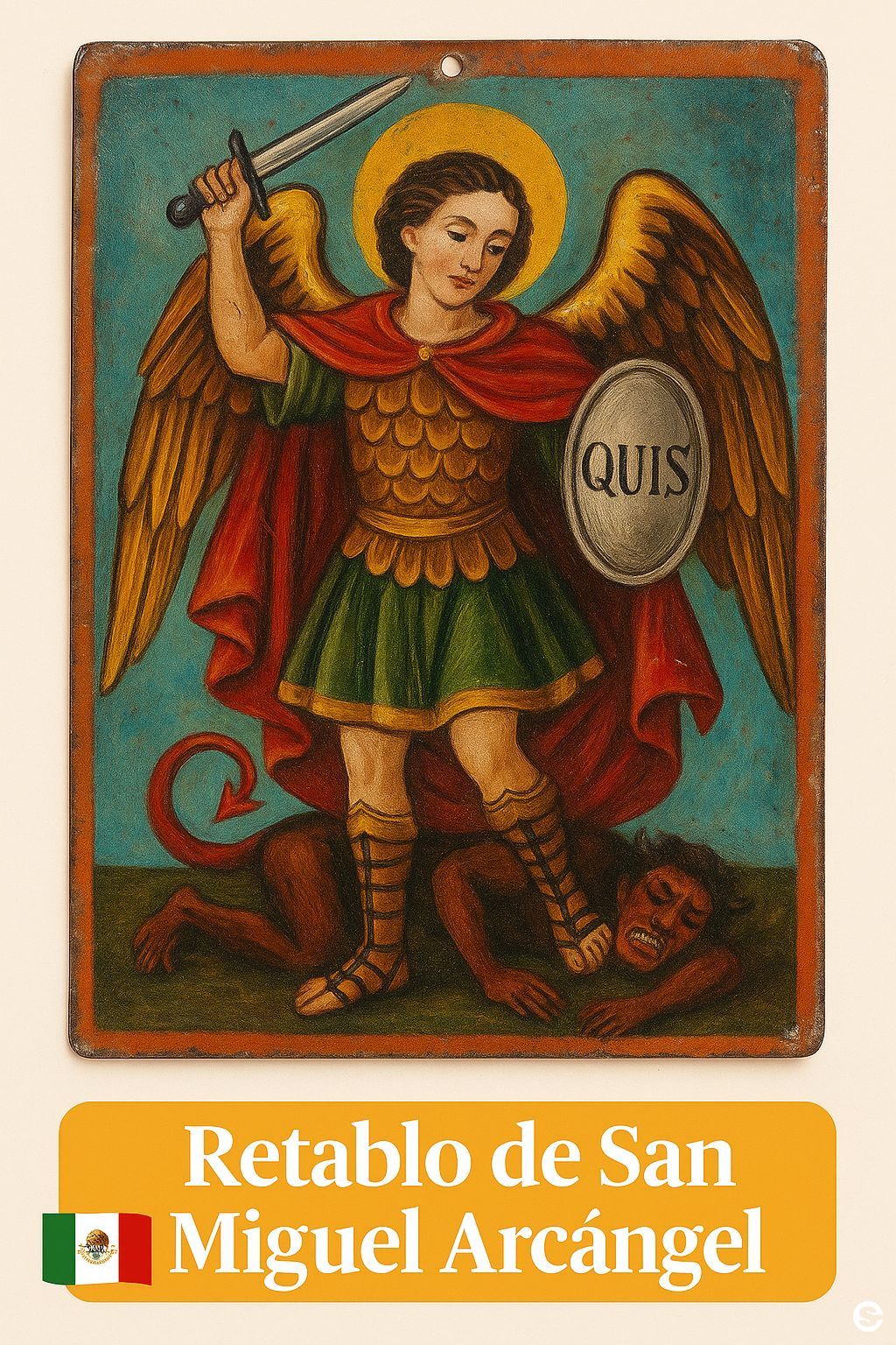 Pintura devocional popular en metal, representando a San Miguel como ...