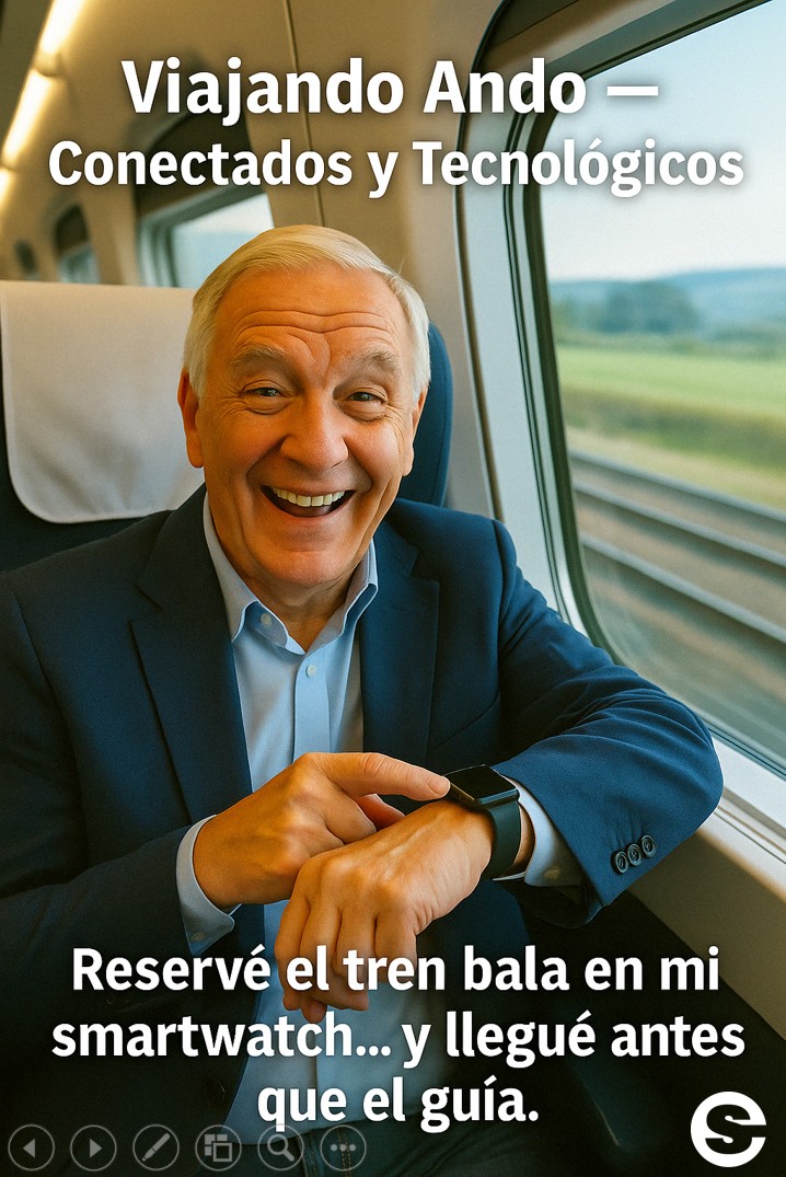 📱 Conectados y Tecnológicos “Reservé el tren bala en mi smartwatch... y llegué antes que el guía.”