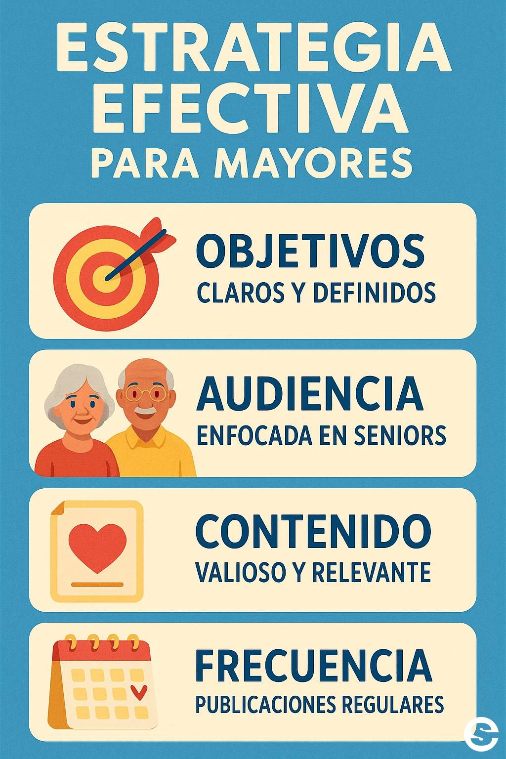 Consejos sobre objetivos, audiencia, contenido valioso y frecuencia en publicaciones enfocadas en seniors.