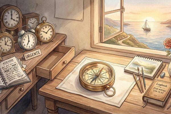 Sin embargo, este es el momento crucial para cambiar de herramienta de navegación. La madurez nos invita a guardar el Reloj en el cajón y sacar la Brújula. Hay una diferencia abismal entre ambas. El reloj mide la cantidad; la brújula mide la dirección. El reloj pregunta ansioso "¿cuánto falta?" y "¿cuán rápido vas?"; la brújula pregunta con serenidad "¿hacia dónde quieres ir?" y "¿dónde está tu Norte?".